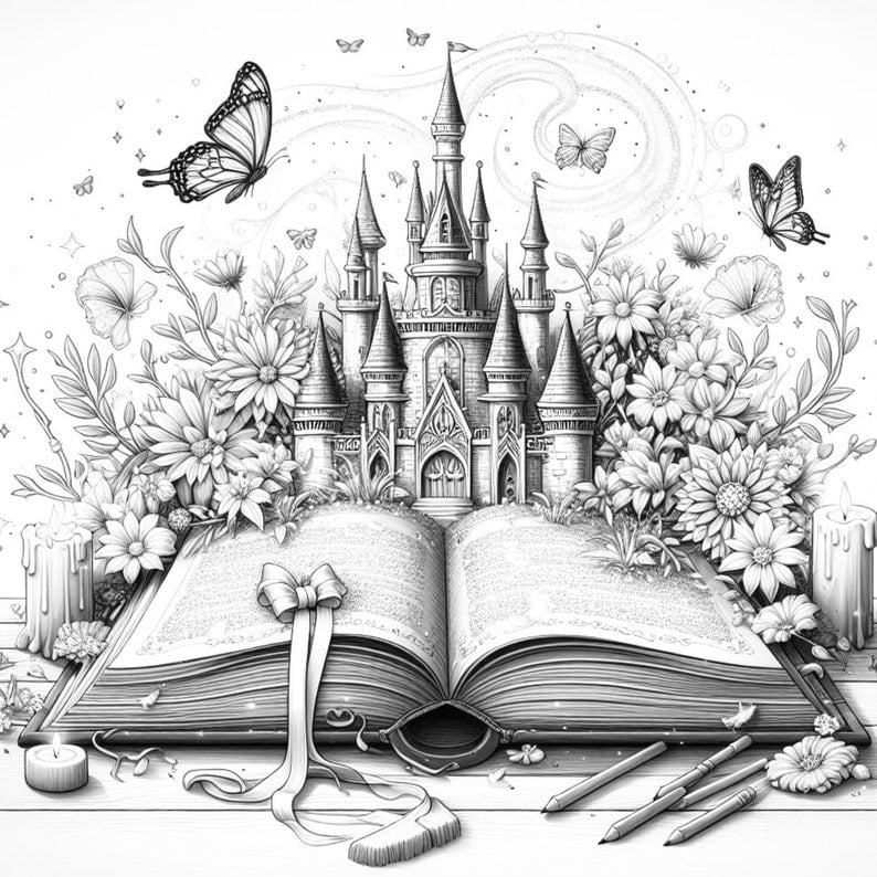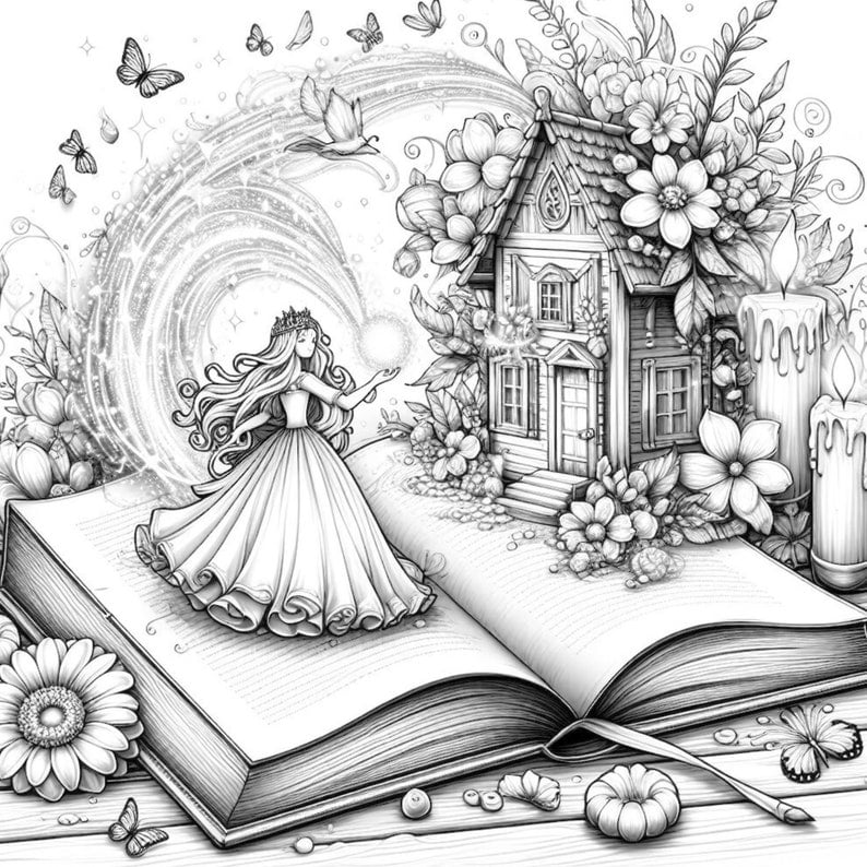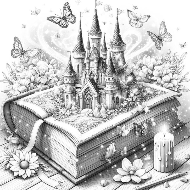 - 120 captivating coloring pages in total, featuring both fantasy interiors and magical open books